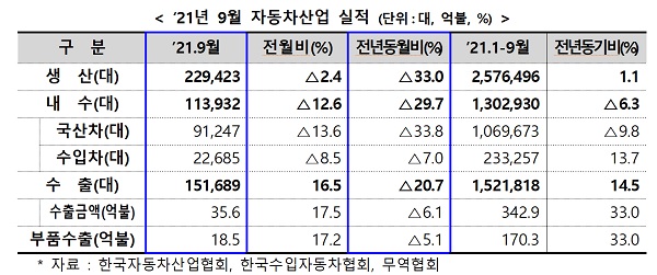 산업통상자원부가 15일 발표한 ‘2021년 9월 자동차산업 월간 동향(잠정)’을 보면 지난달 자동차 생산은 지난해 같은 기간보다 33%, 수출은 20.7%, 수출금액은 6.1%가 감소한 것으로 나타났다.