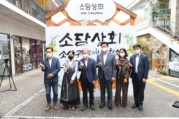15일 서울 인사동 쌈지길 소상공인 플래그십 스토어 개장행사에서 권칠승 중기부 장관(왼쪽에서 세번째)과 관계자들과 기념촬영을 하고 있다.(사진=중기부)