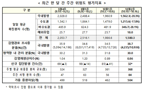 [일간환경연합 한선미 기자]최근 1주간(10월 10~16일) 코로나19 국내 발생 신규환자는 일평균 1562.3명으로 전주 일평균 1960.9명 대비 20.3%(398.6명) 감소했다. 수도권·비수도권 모두 점진적으로 유행규모가 줄어들고 있는 것으로 나타났다.