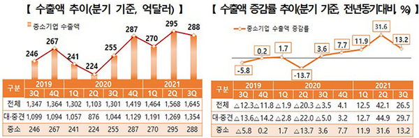 중기부는 올 1·2·3분기 모두 역대 분기별 수출 최고치 경신하면서 올해 중소기업 수출은 신기록을 이어가는 기록적인 성과를 보이고 있다고 설명했다.