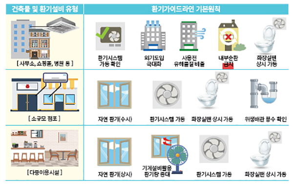 이에 따라 환기 설비 유무 및 건물유형에 따른 구체적인 환기 지침을 제시하면서 창문을 통한 자연환기 일반원칙과 건물유형별 환기 등의 권고사항을 제시했다.