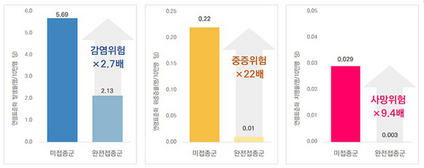 이 결과 9월 5주 기준으로 ‘미접종군’이 ‘완전 접종군’에 비해 코로나19에 감염될 위험은 2.7배, 코로나19로 인해 위중증으로 진행될 위험은 22배, 코로나19로 인해 사망할 위험은 9.4배 높은 것으로 확인됐다.