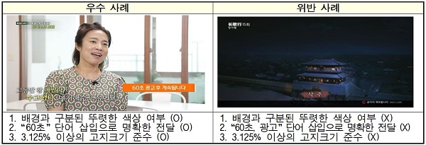 중간광고 고지 우수사례(왼쪽)와 위반사례(사진=방송통신위원회)