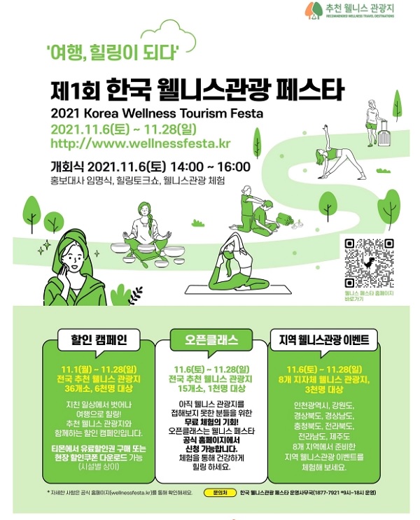 [일간환경연합 한선미 기자]문화체육관광부는 한국관광공사와 함께 ‘여행, 치유(힐링)가 되다’를 주제로 오는 6일부터 28일까지 전국 곳곳에서 ‘제1회 한국 웰니스관광 페스타’를 개최한다고 2일 밝혔다.