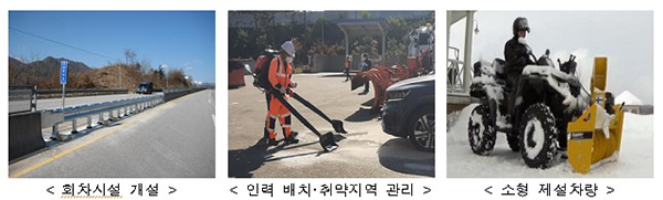 또한 신속한 제설을 위해 제설재와 좁은도로 제설이 가능한 소형장비를 포함한 제설차량, 전진기지를 사전확보했고, 고속도로 졸음쉼터 등 취약구간에 대해서는 인력 사전배치 등의 관리기준을 강화했다.