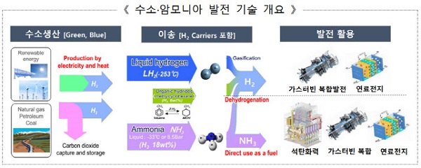 수소·암모니아 발전은 무탄소 연료인 수소(H2)와 암모니아(NH3)를 기존 석탄발전기와 LNG 발전기에 안정적으로 연소해 전력을 생산하는 새로운 발전기술로, 발전설비·송배전선로 등 기존 전력 인프라를 활용하면서 온실가스를 감축시켜 탄소중립을 달성할 수 있는 방안이다.