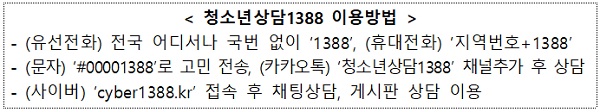 또 청소년상담1388은 청소년의 일상적인 고민 상담부터 가출·폭력·자살 등 위기상담 등을 연중 24시간 운영한다. 전화와 카카오톡, 문자, 온라인을 통해서도 편리하게 상담받을 수 있다.