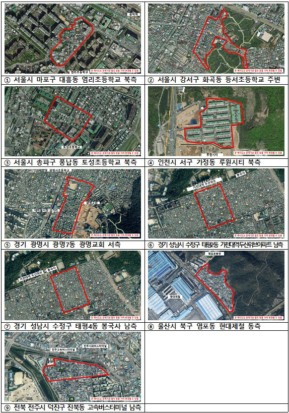 2차 공모 후보지 평가 결과 소규모주택 정비사업이 이미 활성화된 수도권 지역에서는 서울 강서·마포·송파구 등 3곳, 경기 광명·성남 등 3곳, 인천 서구 1곳 등 7곳과 소규모주택 정비사업의 활성화가 필요한 수도권 외 지역에서는 울산 북구 1곳, 전북 전주 1곳이 선정됐다.