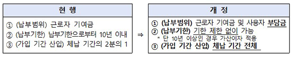 ▲ 국민연금법령 개정에 따른 개별납부제도 개선사항이번 개정안에서는 사업장이 연금보험료를 체납한 경우 근로자가 납부기한으로부터 10년이 지난 체납보험료라도 이자를 더해 납부하면 가입 기간을 인정받을 수 있도록 근로자의 연금수급권을 강화했다.