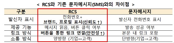 먼저, 메시지 서비스의 신뢰성 확보 방안을 마련했다. 국민 다수가 사용하는 SNS의 공식인증 채널을 통해 이용자에게 정보성·광고성 메시지를 송부, 금융·공공기관 등 사칭을 방지하고, 기업형 RCS(Rich Communication Services) 등 차세대 메시지를 활용한다. RCS의 경우 발신 기업의 정보 제공, URL이 아닌 메뉴 버튼 등 보다 다양한 기능을 통해 사칭을 막을 수 있다.