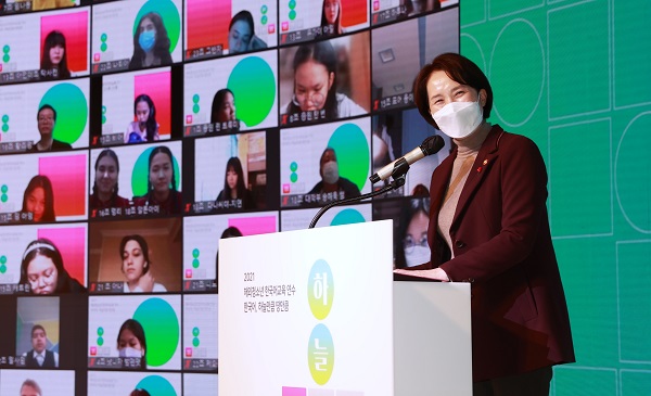 ▲ 유은혜 사회부총리 겸 교육부 장관이 3일 열린 제3회 해외 청소년 한국어교육 연수 폐회식에서 ‘한국문학작품 감상발표회’의 우수작을 발표하고 있다. (사진=교육부)유은혜 사회부총리 겸 교육부 장관은 “이번 연수에 참석한 해외 청소년들이 한국어 실력을 더욱 갈고 닦는다면 한국과 모국을 잇는 든든한 가교역할을 할 수 있을 것”이라며 “해외 청소년들이 양질의 한국어 교육을 받을 수 있도록 앞으로도 한국어 교육 기회를 확대하고, 필요한 지원을 아끼지 않겠다”고 말했다.