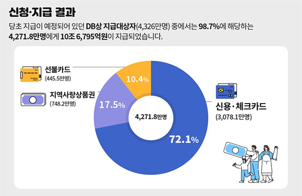 당초 지급이 예정돼 있던 DB상 지급대상자(4326만명) 중에서는 98.7%에 해당하는 4271만 8000명에게 지급됐다.