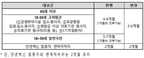 다만 해외출국과 질병치료 등 개인사정이나 감염취약시설 및 의료기관 등의 단체접종 일정상 불가피한 경우, 또는 잔여백신 접종 희망자 등은 각각 3개월과 4개월로 1개월 단축해 접종이 가능했다.