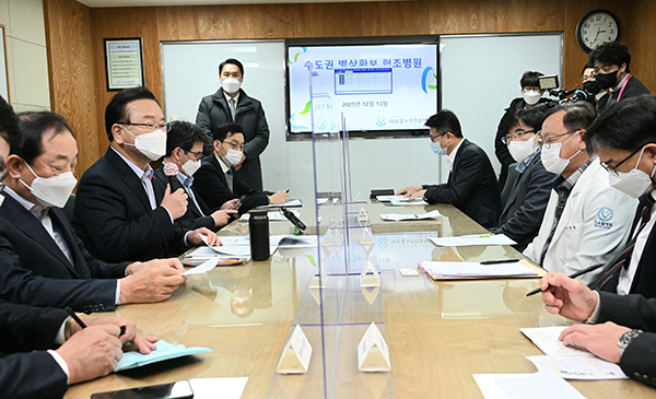 [일간환경연합 김경훈 기자]김부겸 국무총리가 13일 서울 구로구 미소들병원을 찾아 수도권 병상 확보 협조병원장들과 간담회를 열고 행정명령과 관계없이 자발적으로 병상을 제공해 준 병원들에 감사인사를 전했다.