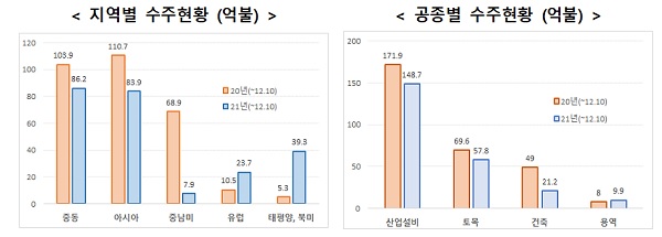 올해 우리 기업의 해외수주는 지난 10일 기준으로 243억 달러를 기록해 지난해 같은 기간보다 21% 줄었다. 지난해는 300억 달러 초과달성으로 반등했으나, 올해는 팬데믹 장기화에 따른 불확실성 등으로 감소로 돌아섰다.