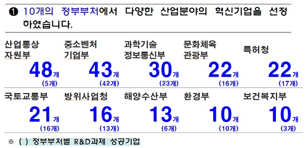 해수부는 해양수산 분야를 대상으로 수산물 유통 플랫폼·수중로봇·해양바이오 등 13개 기업, 환경부는환경 분야를 대상으로 청정대기·자원순환·스마트 물·녹색 융복합기술 기업 등 10개 기업, 복지부는 보건복지 분야를 대상으로 혁신의료기기 부문·보건신기술 부문 등 10개 기업을 선정했다.