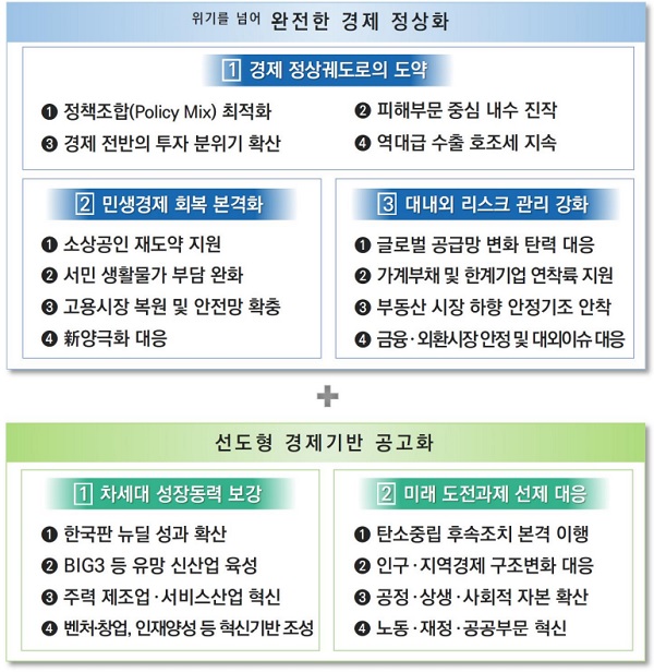 완전한 경제 정상화 과제로 ▲경제 정상궤도로의 도약 ▲민생경제 회복 본격화 ▲대내·외 리스크 관리 강화를 추진하기로 했다.