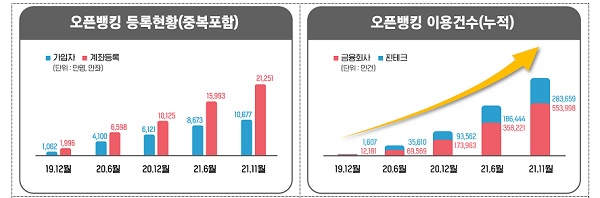 [일간환경연합 김경훈 기자]금융혁신을 촉진하기 위해 도입한 오픈뱅킹이 전면 시행 2년만에 순가입자수 3000만명을 넘어서고, 순등록계좌수는 1억개를 돌파한 것으로 나타났다.