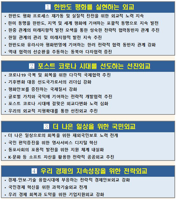 또한 더 나은 일상으로의 회복을 위한 재외국민보호 노력을 전개하며 경제-안보-기술 융합시대에 부응하는 전략적 경제안보외교를 강화할 방침이다.