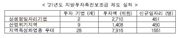 한편, 산업통상자원부는 지방투자촉진보조금 제도를 통해 지난해 69개 지방투자 기업에게 국비 1923억을 지원하기로 결정해 향후 3년 동안 지방에 1조7200억원 규모의 민간 투자를 유도하고, 3400개의 신규 일자리를 창출할 수 있을 것으로 기대된다.