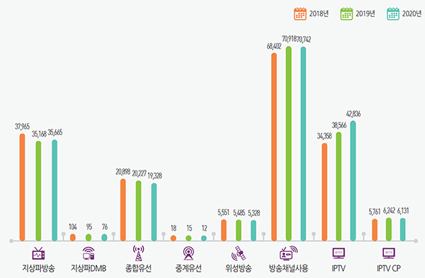 방송분야 종사자 수는 3만 7000여 명으로 전년대비 420명이 감소(-1.1%)했다. 사업자별 종사자 수는 지상파 1만 3827명(-631명, 전체의 37.2%), 유료방송 6014명(+161명, 전체의 16.2%), PP 1만 7249명(+68명, 전체의 46.5%)으로 나타났다.