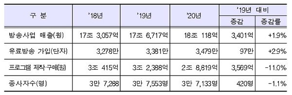 [일간환경연합 한선미 기자]지난 2020년도 국내 전체 방송시장은 18조 118억 원 규모로 전년대비 1.9% 증가했다. 유료방송 가입자는 3479만 단자, 방송프로그램 제작·구매비 약 2조 9000억 원, 종사자 약 3만 7000명 등으로 나타났다.