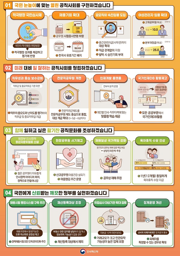 또 일하고 싶은 근무여건 조성을 위한 ‘범정부 인사정책 청년 자문위’를 신설하고, 국민이 직접 적극행정의 성과를 평가하는 ‘국민심사제’ 등을 도입하기로 했다.