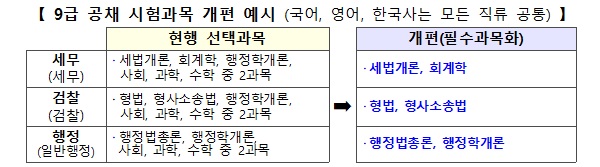 한편, 올해부터는 신규자의 직무역량과 대국민 행정서비스의 품질 향상을 위해 9급 공채 시험과목에서 행정학 등 직류별 전문과목이 필수화된다.