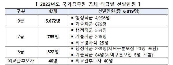 직급별 선발인원은 9급 공채 5672명, 7급 공채 785명, 5급 공채 362명(외교관후보자 40명 포함)이다. 이 중 일선 현장에 배치될 7·9급 공채 인원은 총 6457명으로, 전체 선발 인원의 94.7%에 해당한다.