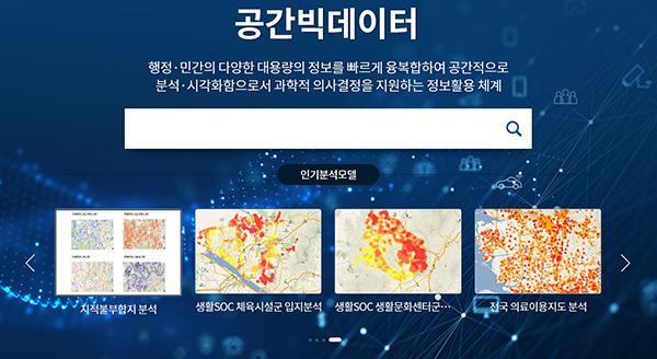 ▲ 공간빅데이터 분석플랫폼(www.geobigdata.go.kr) 메인화면.공간빅데이터 표준분석모델이란 공간정보를 기반으로 각종 정책결정 등에 활용할 수 있도록 데이터의 형식과 분석절차 등을 표준화한 모델이다.