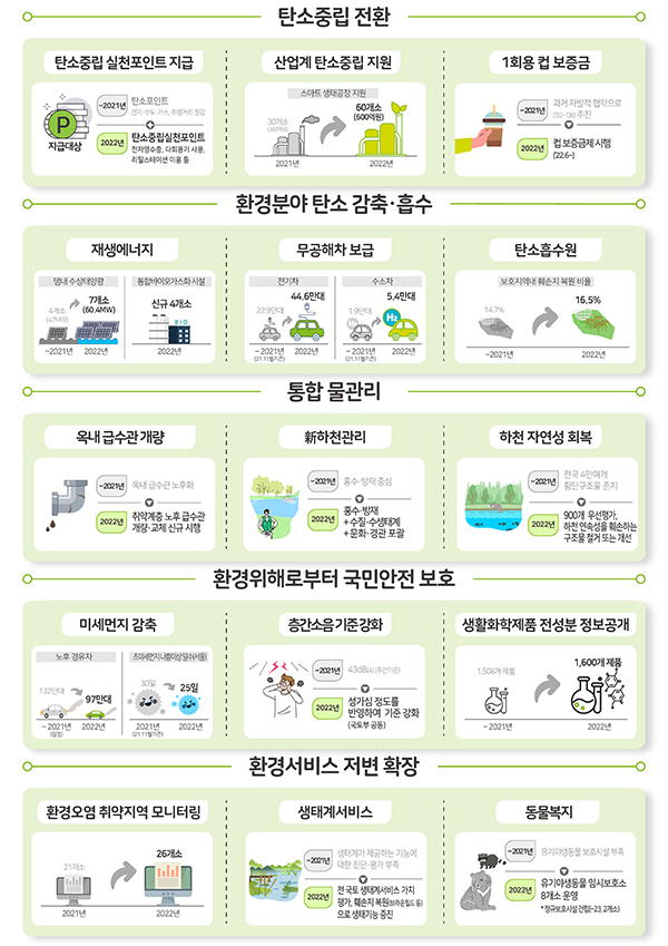환경부는 이와 함께 환경오염 취약지역·계층에 대한 선제적 서비스와 함께 생태계 건전성을 증진하여 자연이 주는 혜택을 늘리겠다고 밝혔다.