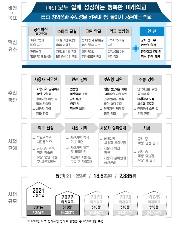 이와 함께 ▲공간 혁신 ▲스마트 교실 ▲그린화 ▲학교시설 복합화 등 미래학교의 네 가지 핵심요소에 ‘안전’을 더한다. 미래형 교육을 위한 학교 공간 조성은 물론, 감염병 우려 등이 없는 더욱 안전하고 안심할 수 있는 미래학교 조성 계획에 따른 것이다.