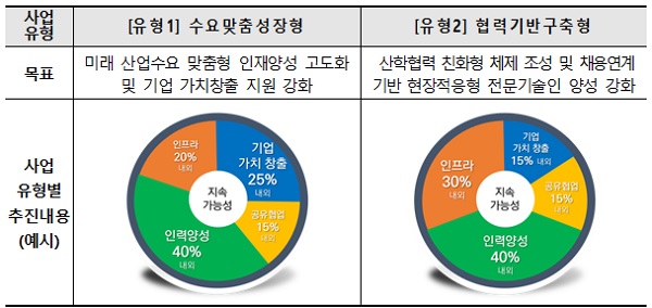 ‘수요맞춤성장형’은 산업계와 미래사회 수요에 맞는 인력 양성, 기업 지원 활성화를 목표로 한다. 수도권, 충청권, 호남제주권, 대경강원권, 동남권 등 권역 단위 평가로 권역별 각 8개교 내외 등 총 40개교 내외를, 이후 권역단위 선정 탈락 대학 간 전국단위 경쟁을 거쳐 10개교 내외를 지정한다.
