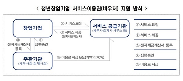 이번 사업은 신청부터 비용 지급까지 모두 온라인으로 진행된다. 창업기업이 온라인으로 사업 신청을 하면, 선정된 창업기업에 100만원의 이용권(바우처)를 지급하고 창업기업은 원하는 기관에서 자유롭게 서비스를 이용한 후 서비스 제공기관에서 발행한 전자세금계산서를 창업지원포털(www.k-startup.go.kr)에 등록하면 된다.