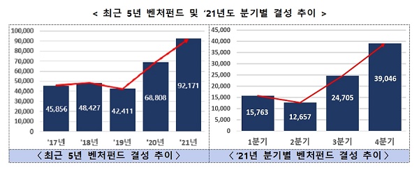 지난해 벤처펀드 결성은 2020년 대비 34%(+2조 3,363억원) 증가한 9조 2171억원었다. 이는 역대 최초로 9조원을 돌파한 것으로, 종전 최대 결성실적인 6조 8808억원을 무려 2조 3000억원 이상 경신한 역대 최대 수치다.