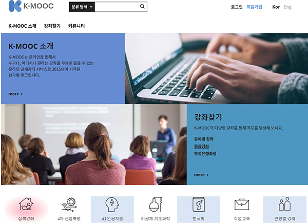 [일간환경연합 신상미 기자]비대면 시대에 모든 국민의 평생학습 지원을 위해 운영 중인 한국형 온라인 공개강좌 ‘케이무크(K-MOOC)’에 258억 원을 투입, 세계적 석학의 교양강좌 개발이 확대된다.