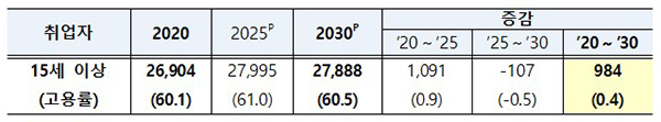 또한 15세 이상 취업자는 2030년까지 98만 명 증가하지만 고령화 및 산업구조 변화 등의 영향에 따라 2025년을 정점으로 감소세로 전환할 것으로 내다봤다.