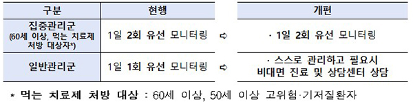 앞으로 재택치료자 환자는 60세 이상 등 집중관리군과 일반관리군으로 분류, 모니터링은 집중관리군 중심으로 조정한다.