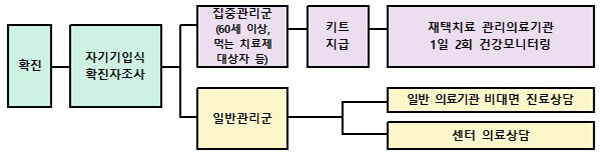 먼저 집중관리군은 재택치료관리의료기관에 배정해 모니터링하는데, 보건소에서는 확진자의 현재 증상과 기저질환 등 건강상태를 확인하고 비대면진료 등 재택치료 시 의료상담 방법을 안내한다.