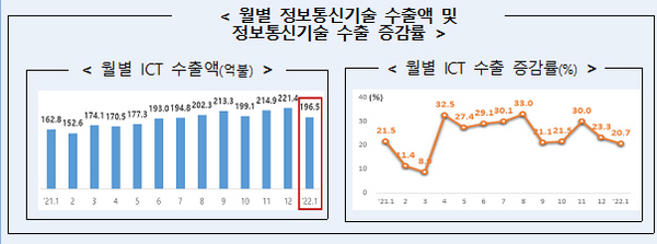 [일간환경연합 신상미 기자]지난달 우리나라 정보통신기술(ICT) 수출액은 전년 동월대비 20.7% 증가한 196억 5000만달러로, 역대 1월 중 최대 규모 실적을 달성했다. 지난해 4월 이후 10개월 연속 두 자릿수의 견조한 성장세를 지속했고, 주력 시장과 주력 품목 대부분이 수출 호조세를 보였다.