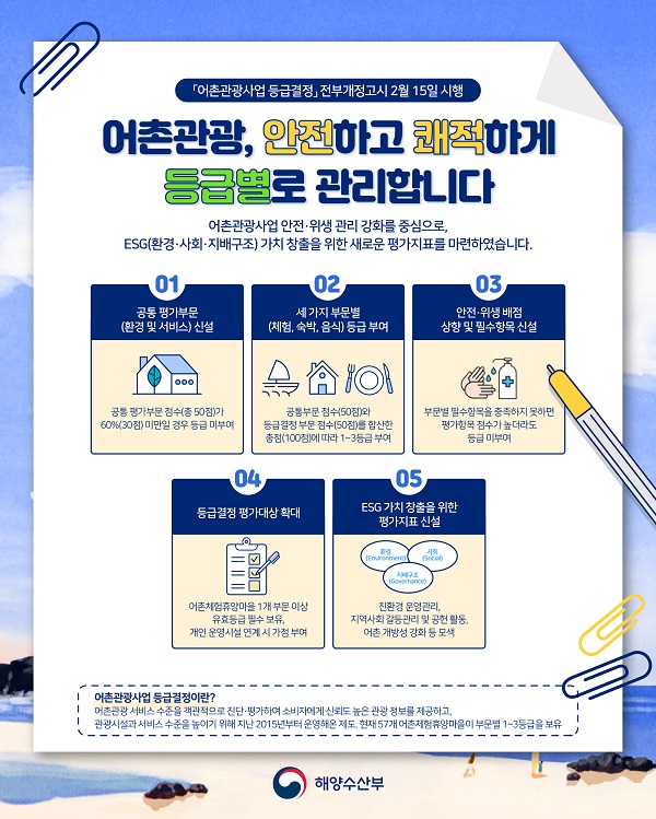 최종욱 해수부 어촌어항과장은 “이번 어촌관광 등급제 개편을 통해 국민들에게 더욱 안전하고 쾌적한 어촌관광 서비스를 제공할 수 있을 것으로 기대된다”며 “어촌관광이 지역사회의 개방과 사회적 기여에도 앞장설 수 있도록 노력하겠다”고 말했다.