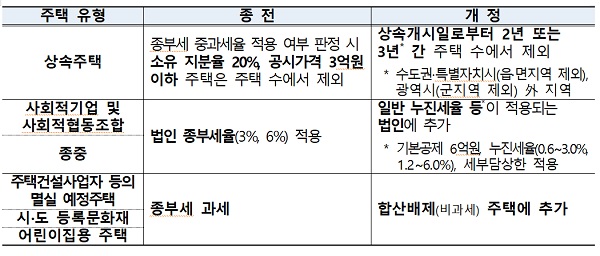 상속주택의 경우 상속개시일로부터 2년 또는 3년 동안 종합부동산세 과세 표준에는 합산하되 세율 적용 때 주택 수에서 제외하는 한편, 사회적기업 및 사회적협동조합, 종중에 대해서는 일반 누진세율이 적용되는 법인에 추가해 세부담을 완화한다.
