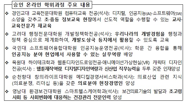 승인된 학위과정은 ▲경인교대 교육전문대학원 컴퓨터교육 전공(석사) ▲고려대 행정전문대학원 개발정책학 전공(석사) ▲국민대 소프트웨어융합대학원 인공지능운영 전공(석사) ▲목원대 하이테크학과 웹툰디자인드로잉 전공·애니메이션가상현실(VR) 캐릭터 디자인 전공(석사) ▲순천향대 창의라이프대학원 메디컬경영서비스학과(석사) ▲영남대 환경보건대학원 스마트헬스케어학과(석사) 등이다.