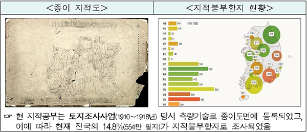 이에 따라 국토부 지적재조사기획단은 지난 2018년부터 지적공부와 실제 토지이용현황이 일치하지 않는 지역을 대상으로 지적재조사와 도시재생사업 등 국책사업 간 협업제도를 추진하고 있다.