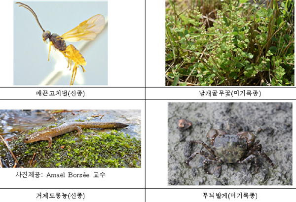 이번 국가생물종목록에는 거제도롱뇽, 매끈고치벌 등 지난해 한 해 동안 발견된 436종의 신종을 비롯해 날개골무꽃, 꼬마쥐치, 고리손가락새우, 무늬발게 등의 미기록종을 포함해 총 1,820종이 새롭게 추가됐다.