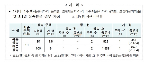 예를 들어 조정대상지역에 주택(공시가격 10억원)을 한 채 보유한 1세대 1주택자 A씨가 올해 3월 1일 조정대상지역의 주택(공시가격 6억원)을 단독으로 상속받을 경우 종전 법령 기준으로 A씨는 1833만원의 종부세를 내야 한다. 하지만 개정 시행령 기준으로는 종부세가 849만원으로 984만원 줄어든다.