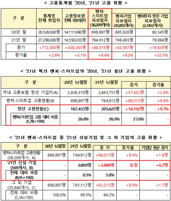 벤처·스타트업 고용 증가율 9.4%은 우리나라 전체 기업 증가율 3.1% 대비 3배 이상 높은 수준이다. 특히 벤처투자를 받은 기업의 고용 증가율은 32.5%로 전체 기업 대비 10배 이상 높았다.