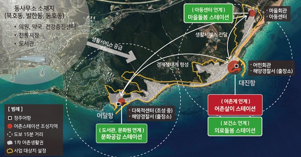 ▲ 강원도 동해시의 어촌생활권 설정 및 어촌스테이션 운영계획.어촌활력증진지원 사업은 어촌 인구감소를 막기 위해 건강, 노인 및 아동 돌봄, 교육, 문화 등 어촌의 생활서비스를 개선해 방문 위주의 관계인구를 지역에 정착해 살아가는 정주인구로 전환시키는 사업이다.