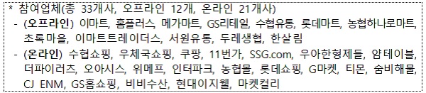 이번 봄맞이 행사에는 이마트, 홈플러스, 롯데마트, GS 리테일, 이마트트레이더스 등을 포함한 오프라인 12곳과 SSG.com, 쿠팡, 위메프 등 온라인 쇼핑몰 21곳이 참여한다.