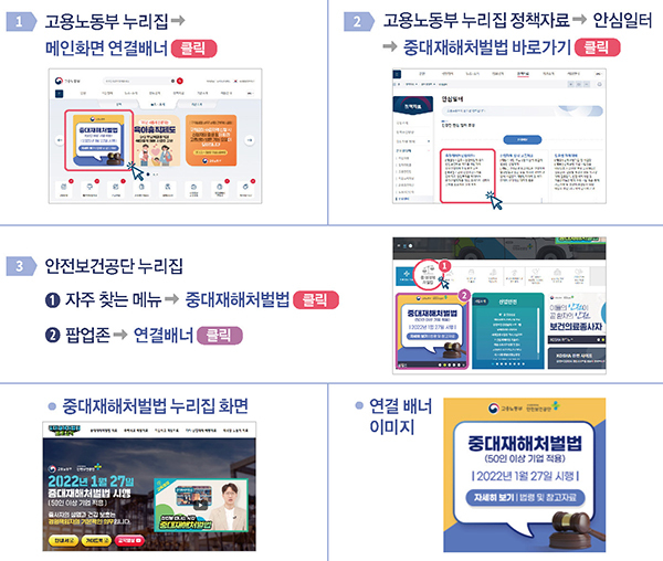 ▲ 중대재해처벌법 누리집 연결방법권기섭 고용부 산업안전보건본부장은 “기업 내 안전보건 사항에 절대적인 영향을 미치는 경영책임자부터 꾸준히 관심을 갖고 노력할 때 현장의 안전보건 조치들이 확보되고 종사자의 행동 변화도 일어난다”고 강조했다.
